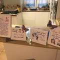 Finalmente ho finito Di preparare le bustine per i fazzoletti per le lacrime di gioia e la loro scatola per contenerli con fiori e farfalla dipinta da me Anche l’adesivo l’ho fatto io x farlo...