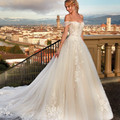Il primo abito è il mio preferito. Quando l'ho visto ho fatto un sospiro talmente forte che si è girato FM! Una nuvola di tulle, appena uscito da un libro di fiabe. SI tratta del modello NI121A5 con gonna di tulle avorio e ricami di pizzo bicolor e spalline di voile di tulle a scollo omerale.