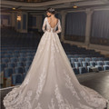 In questo modello di Pronovias Privee troviamo un corpetto aderente con scollo a V decorato da un intricato ricamo in pizzo che prosegue nelle maniche semitrasparenti. Un'ampia gonna a ruota e uno strascico importante montato sulla parte bassa della schiena completano questo abito che mozza il fiato.