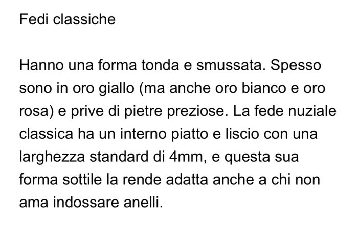 Dall'altra parte però l'idea della personalizzazione mi piace, per cui nel caso in cui scegliessimo effettivamente poi le fedi tradizionali, vorrei che almeno nell'incisione interna avessero un dettaglio in più, oltre ovviamente ai nomi e la data.