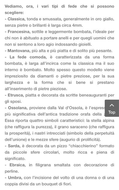 Ragionandoci su, in realtà, mi sto comunque convincendo (parlo soprattutto per me perché per il mio compagno la differenza tra le 3 opzioni è meno significativa, ma la scelta è ovviamente condivisa) a scegliere la fede classica, anche per questione di praticità e resistenza, a lungo termine, e nel quotidiano. Pensavo poi che mi piacerebbe "arricchirla" nel tempo, in occasione magari di anniversari particolari, facendovi incastonare ad esempio dei diamanti o affiancandogli un altro anello (nel mio caso non posso affiancargli già l'anello di fidanzamento perché non adatto ad essere accostato ad altri anelli).
