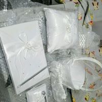 Ciao sposine finalmente mi è arrivato il set con guest book,cuscino porta fedi, porta penna, cestino e giarrettiera!!tutto questo a un prezzo bassissimo!!!anke xke bisogna un po risparmiare ehehe