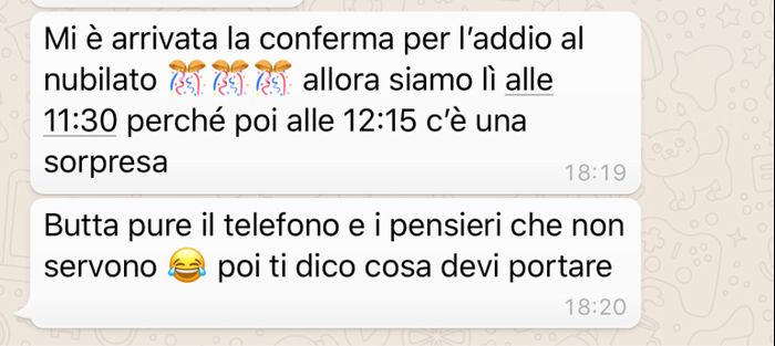Ciao ragazze... volevo condividere con voi il messaggio che mi è appena arrivato... dopo aver avuto un amara delusione dalle altre ragazze ( testimone compresa) riguardo il mio addio al nubilato, oggi questa mia amica mi manda questo messaggio... non...