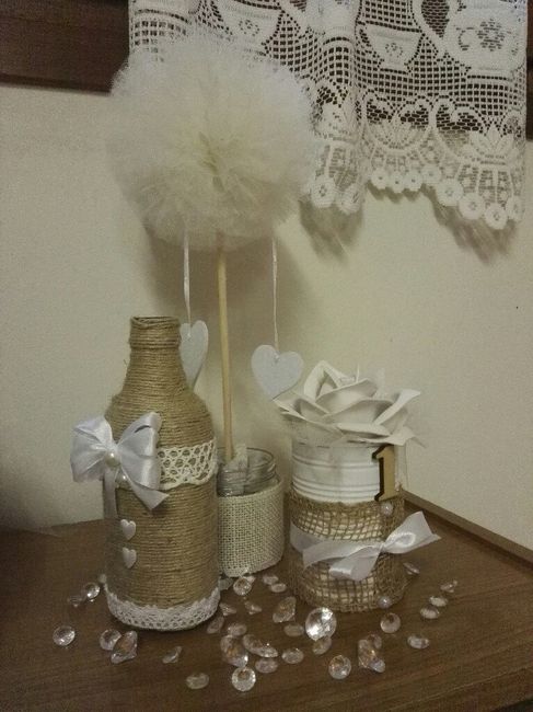 Buongiorno sposine!vi mostro alcuni fai da te,magari possono essere di spunto per altre!Scatolina non invitatiL'insieme che formerà il centro tavola(manca la nebbiolina nella bottigliaConi confettataBouquetBottoniereSegnapostoPortafediBomboniere...