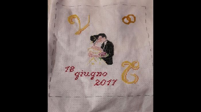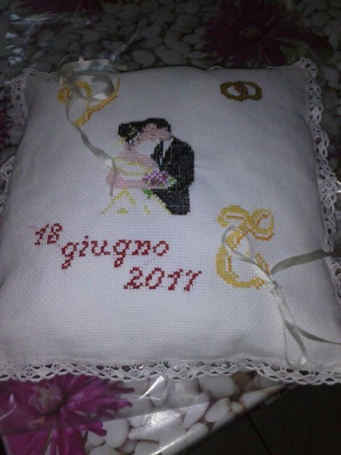 Ecco ragazze il mio cuscino portafedi fatto a punto croce! Devo solo prendere la fodera dietro , cucirla alla tela aida e riempirla di ovatta! Che dite del mio lavoretto personalizzato?