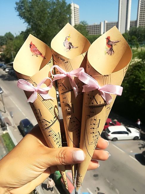 Ciao a tutte, buon 25 aprile! Non so voi sposine ma io mi sto divertendo un sacco a fare tutte le cosine necessarie per il matrimonio, oggi sto ultimando i coni porta riso, mi fate vedere i vostri? Il mio tema è musica e uccellini!