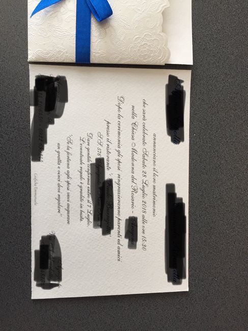 Ragazze queste sono le nostre partecipazioni, la scritta dei nostri nomi è in blu 😍😍 scusate ma ho annerito i dati !! Sono bellissime 😍😍😍io le amo!!!