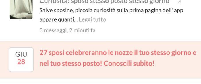 Salve sposine, piccola curiosità sulla prima pagina dell' app appare quanti sposini nel vostro stesso giorno e nello stesso posto. Vi va di condividerli? Giusto per curiosità per capire anche quali sono le date più gettonate 😄😄Napoli 9 dicembre