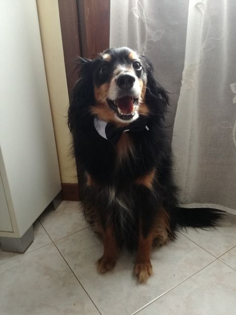 Fervono i preparativi anche tra i miei figlioli pelosi! Zara, 42 kg, con la sua coroncina di fiori bianchi cui ho aggiunto nastri verdi e fucsia (i tre colori del tema del nostro matrimonio) e Argo, 35 kg, elegantissimo con il suo papillon di raso...