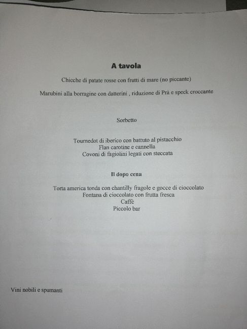 Buongiorno ragazze... A - 3 settimane abbiamo il nostro menù definitivo....l'aperitivo verrà servito a buffet con disposizione a isole con quelle dei fritti e flambé in show cooking mentre la cena sarà da seduti con servizio al tavolo. Cosa ne...