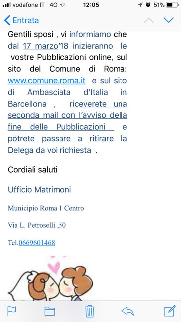 Care sposine, dopo decine di inconvenienti e rallentamenti, causa Consolato d’Italia a Barcellona e lentezze del comune di Roma, da oggi abbiamo le pubblicazioni!!! Non resta che ritirare la delega per il Mubicipio di Treviso e convincere il sindaco...