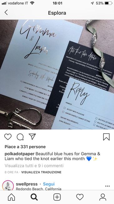 Ciao sposine, sto continuando a farmi una panoramica di tutto l’occorrente per definire come impostare il mio matrimonio. Chi mi mostra le sue partecipazioni? Grazie ☺️