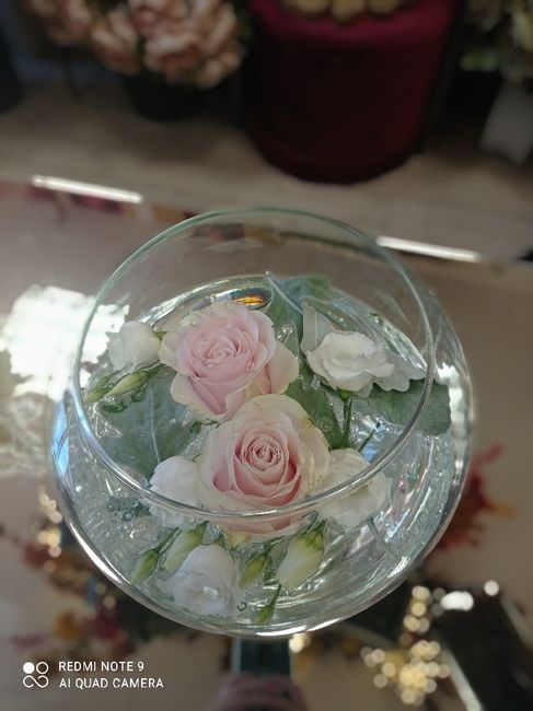 Ciao a tutte! Stasera con la fioraia abbiamo fatto la prova dei centrotavola del nostro matrimonio. Abbiamo scelto rose, lisianthus bianchi e foglie innevate. ♥️ Sotto la boule verrà poi posizionato uno specchio tondo. Vi piace il risultato? A me...