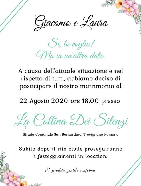 Ciao Brides...ahimé noi dovevamo sposarci il 27 giugno ma visto che per quella data sicuramente staremo ancora in fase due..siamo costretti a provare con il piano B ossia 22 agosto 2020, sperando di non dover rimandare ulteriormente. Ho preparato il...