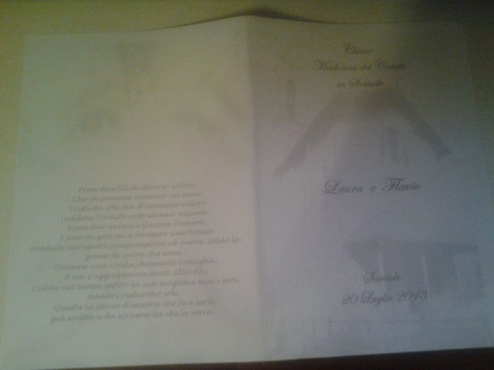 ragazze ho bisogno di voi... cosa mi consigliate??? le foto sn uscite malino purtroppo copertina libretto messa: il dilemma è che scrittura, scritta my wedding day o no, immagine santuario si o no... 1 e 2 3 e 4 poesia ringraziamenti fine libretto...