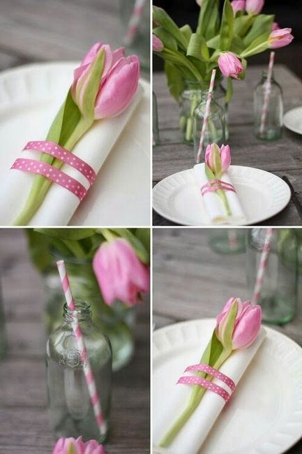 Cosa ne pensate di fiori finti ai tavoli nella location?Premetto che sono la prima a non amare i fiori finti ma i fiori quelli veri li adoro : Solo che per tagliare sulle spese vorrei mettere dei tulipani legati al tovagliolo come quelli della...