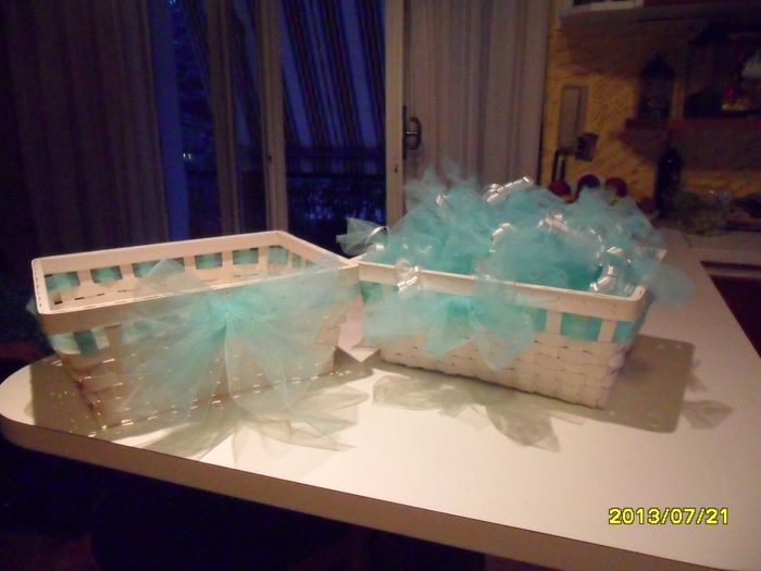 ecco i cestini comprati e decorati oggi per i coni e i fiocchi per le auto.. mia mamma mi ha fatto dei bellissimi fiocchi con tutte color tiffany e nastrino bianco... al posto dei soliti che si vedono.. che ne pensate??