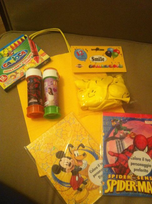 Ciao ragazze, ho pensato di creare una piccola wedding bag per i nostri piccoli ospiti, conterrà le bolle di sapone, pastelli a cera, un piccolo album da colorare e dei palloncini, non so se aggiungerò altro, voi avete qualche sorpresina per i più...