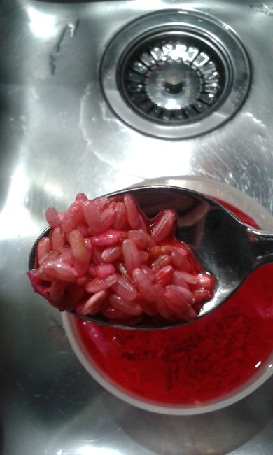 Finalmente sono riuscita a fare una prova !! Carta crespa in ammollo per un paio d'ore in acqua calda e poi, dopo aver lavato il riso e aver buttato la carta tenendo solo il liquido colorato, unire il riso... quanto più lo terrete tanto più scuro...