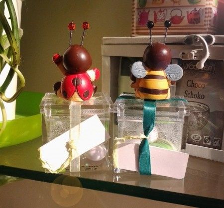 Noi le abbiamo prese ieri. .sono delle statuette in pietra fatte in africa..abbiamo scelto 5 diverse forme che simboleggiano la carezza gli anelli unione ..ecc dentro ci sarà la spiegazione. . Con la confezione sono circa 12 € l una..x i testimoni...