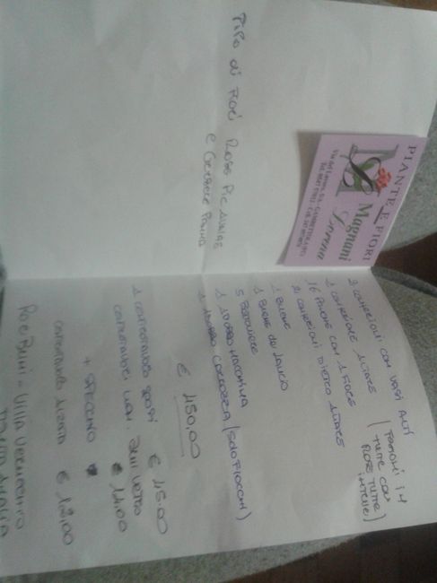 Ciao a tutti, ho 2 preventivi x chiesa e ristorante, me ne manca uno! Voi cosa spendete? Ho chiesto a tutti le stesse cose e mi cambia da 725 a 450! Voi cosa scegliereste? Ho messo le foto del centrotavola del preventivo da 450, l'altro fiorista nn...