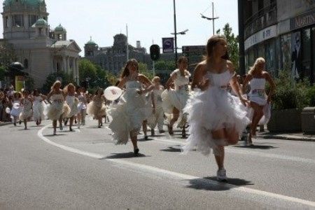bellissima usanza di Belgrado, 50 future spose, vestite di tutto punto che si sfidano a fare una corsa di 150 Mt