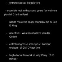 282 giorni faBuonasera, stavo controllando la lista musica e mi stavo chiedendo se bisogna mettere musica di sottofondo per lo scambio delle promesse e per la fine con le firme dei testimoni. 🤔🤔🤔🤔