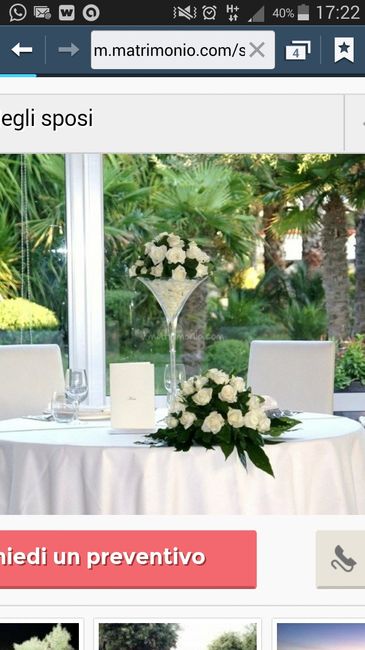 Ciao Ragazze.. Mi è appena arrivato il preventivo del catering.. per i centrotavola (come da foto ma dentro i vasetti sabbia colorata e sulla base dei fiori) mi hanno chiesto 25€ l'uno.. ora.. io non credo saremo più di 10 tavoli.. voi cosa ne...