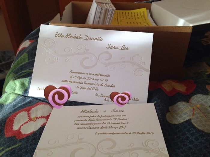 Buon pomeriggio ragazze/iFinalmente sono arrivate le nostre partecipazioni sono troppo contenta. Prese dal sito invitidesign la signora Anna molto disponibile X tutti i dubbi e la spedizione è stata rapida e precisa. Le partecipazioni sono come le...