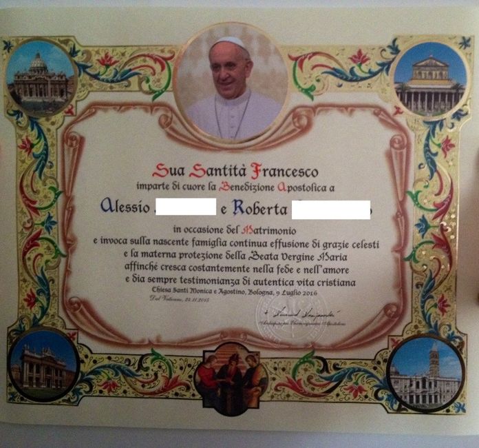 Finalmente da aprile dopo ben cinque richieste tra fax e posta è arrivata anche la mia benedizione papale! Avevo ormai perso la speranza
