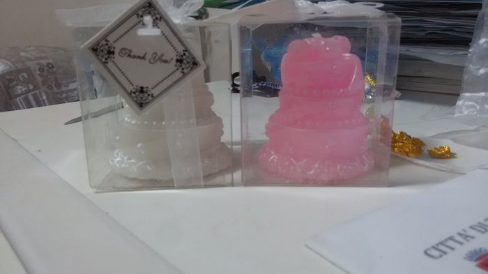 Comprati su aliexpress, sono candele a forma di torta, con scatolina trasparente e etichetta thank you con nastrino di organza... ne ho prese 75 rosa e 75 avorio e ho pagato 213 più 42 di dogana. Totale 255 euro. Sono costate quindi circa 1,70 l'una....