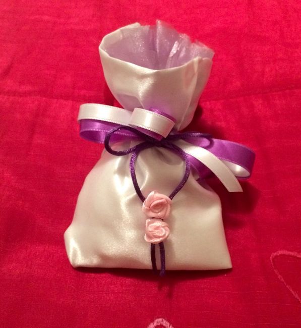 Ragazze, Sto facendo una quindicina di sacchetti per la comunione della figlia di mia cugina. Ecco la bozza, quale vi piace di piú fiocco bianco o doppio fiocco bianco e viola?