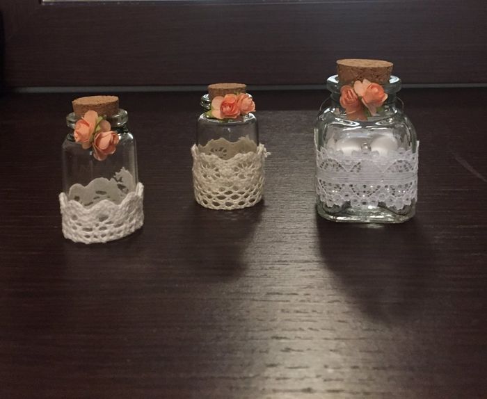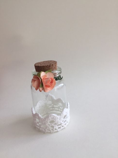 ciao Ragazze oggi ho provato al volo a fare delle prove dei segnaposto confezionati da me. Le boccette piccole sinceramente le preferisco ma non posso metterci dentro i confetti perché non entrano, quindi avevo pensato ai confettini piccoli oppure...