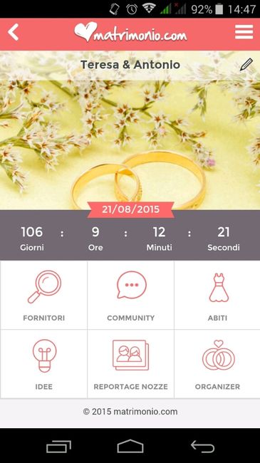 Ciao a tutte.. come vanno i preparativi e soprattutto quanto manca al grande giorno?.. Io e il mio fm siamo a buon punto...stiamo oranizzando tutto nei minimi dettagli..siamo felicissimi di questo grande passo e non vediamo l'oraaaaaaaa... Mancano 15...