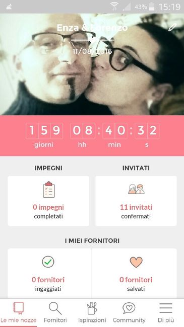 Ciao belle! Mi sposo m'11 Agosto 2016 dopo 1000 peripezie! Adesso mi trovo in fase super stress e me la prendo con tutti ma per fortuna Fm mi supporto e soprattutto mi sopporta!!!!! Non vedo l'ora che arrivi il giorno 12 per svegliarmi e trovare mio marito che riposa beato al mio fianco!
