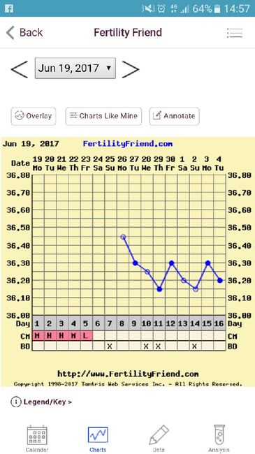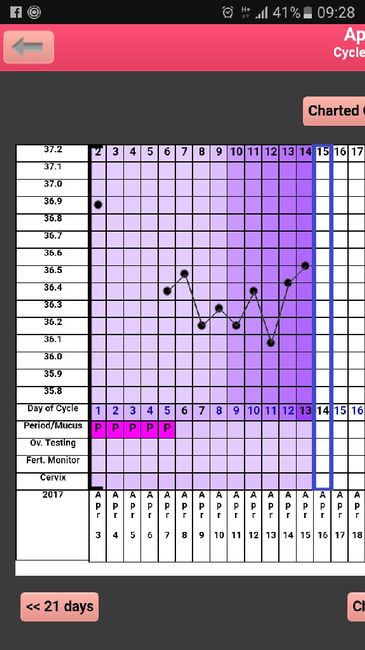 Buongiorno a tutte...allora il mio ciclo secondo la mia app in base all'ovulazione era previsto per il giorno 24...in effetti il 23 sera sulla carta c'erano delle piccole striature rosacee e niente di più...il 24 mattina tb calata di tanto ma sempre...