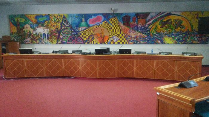 Mi fate vedere le vostre composizioni per la sala con rito civile in comune? Come allestirete o avete allestito? La nostra sala é questa. Fa molto area congressi ed anche un po' kitsch ma purtroppo non avevamo altra scelta. Non ho idea di cosa fare....