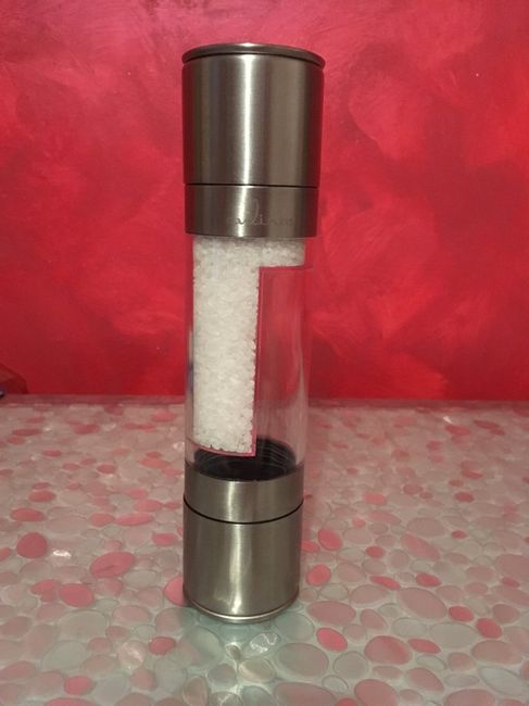 Ragazze chiedo il vostro aiuto perché sto impazzendo....L'idea è quella di usare questo macina sale e pepe come bomboniera,nella foto c'è solo il sale(che poi sarà rosa) e nell'altra parte verrà messo il pepe ma al momento non ne ho...A voi...