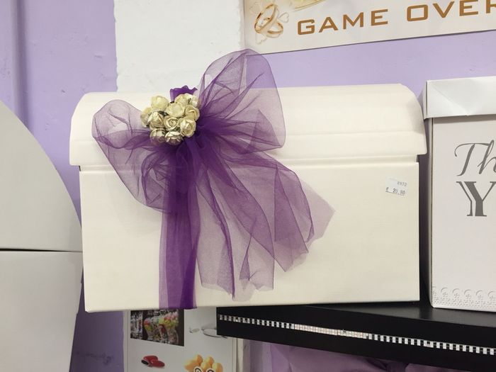Alla fine pensiamo di mettere un baule tipo questo per le buste regalo. Ovviamente cambieremo il nastro e il fiore però una cosa del genere.