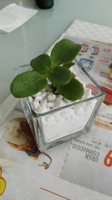 Buongiorno ragazze..dopo aver finalmente trovato i vasetti di vetro che tanto ho cercato eccomi alla mia prima prova! È solo per rendere l'idea...datemi un consiglio vi prego!! A me sembra carina..la piantina è vera, il bigliettino è solo indicativo...
