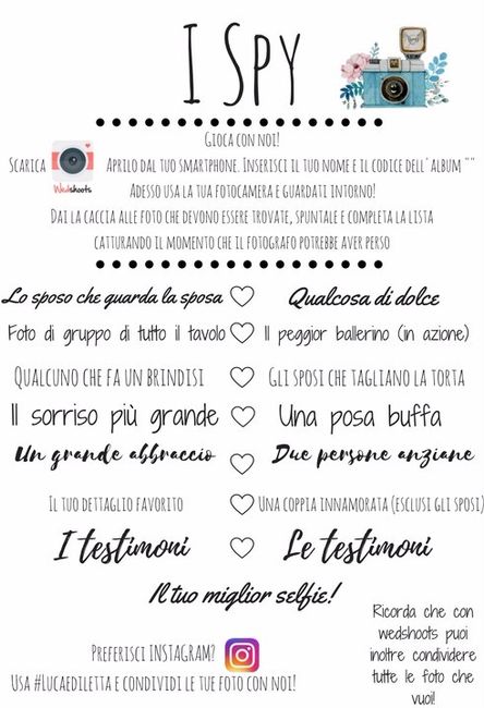 Ciao ragazze, volevo fare il gioco dell'i spy per il ricevimento, chi di voi lo ha già fatto o lo farà? mi dite le misure del cartoncino e con che programma lo creerete? Postate qualche foto! Aggiornamento: ce l'ho fatta!!!! Ho provato con Canva e...