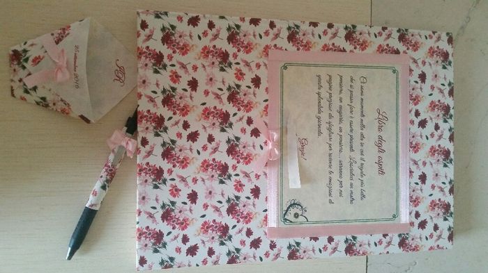 3527 giorni faContinuano i fai da me con grande soddisfazione. Dopo i portaconfetti per la confettata è la volta del guesbook e penna. Il quaderno già rivestito della carta floreale si acquista nelle cartolerie Tassotti (www.Tassotti. it). Ho solo stampato e...