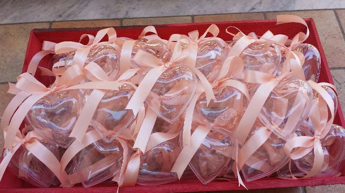 In un giorno solo ho decorato i cuori, saranno completi quando mancherà poco Metterò i confetti e zuccherini pesca avvolti nel velo bianco.Soddisfatta del risultato 😊Sistemero' la gabbietta colorandola di bianco e nastro pesca