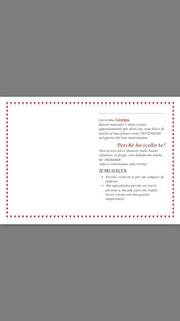 Buongiorno a tutte!Vorrei realizzare il "manuale del perfetto testimone" della sposa e dello sposo. Ho già visto qualcosa su internet... Qualcuna di voi l'ha fatto? Potreste postarmelo per prendere qualche spunto? Grazie! ?