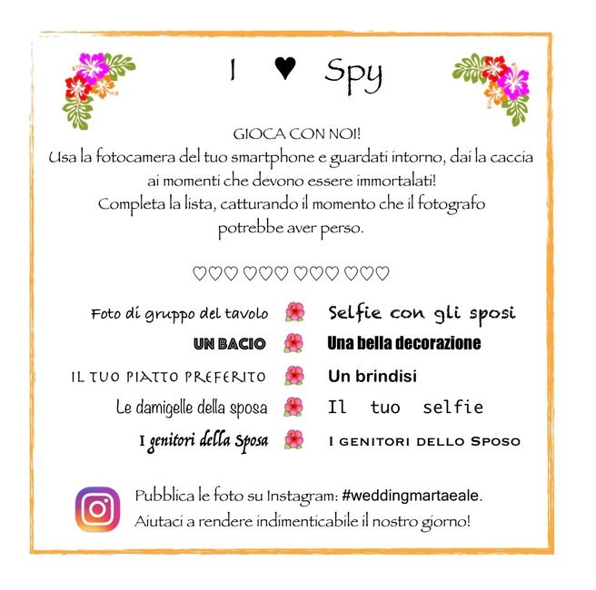 Ciao ragazze, ecco la bozza del mio I Spy. Come formato ho utilizzato 14x14, pensavo di metterne uno su ogni tavolo, ma se invece li metto nella wedding bag? Gli invitati si siedono al tavolo tardi, dopo la cerimonia e dopo il lungo aperitivo ad...