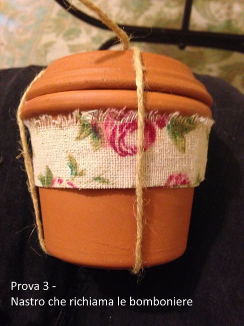 Ciao a tutte! Ho inziato oggi le prove per le bomboniere. Dentro al vasetto metteremo un paio di pasticche di torba e un bulbo o una bustina di semi (ancora da decidere). Ho fatto una montagna di prove e me ne sono rimaste 10 tra cui scegliere. Mi...