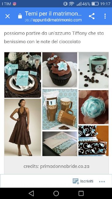 Ciao a tutte sposine... io e il mio futuro marito abbiamo scelto color tiffany... da prima ancora che andasse di moda ci é sempre piaciuto questo colore... a noi piace molto il mare.. ma ho visto in giro che praticamente con questo colore è quasi...