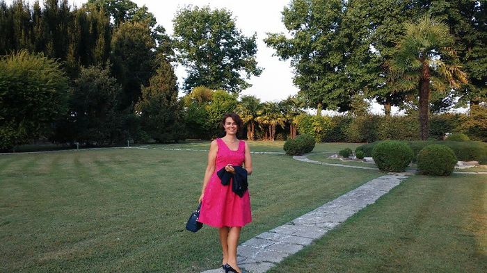 Ecco la scelta della mia mamma, non si vede molto ma ha una cappa che le copre le spalle leggerissima della stessa fantasia dell'abito. Mancano scarpe e borsa blu ed un giacchino sempre blu nel caso di sera facesse freddo