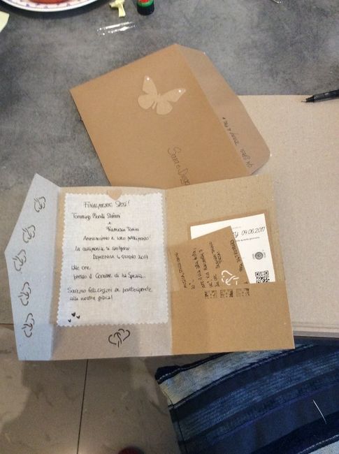 Il caos La busta La partecipazione chiusa Di certo non saranno precisissime. Sono però orgogliosa di me stessa, avendole pensate e realizzate totalmente a mano!!!( partendo da un foglio kraft A3). Estremamente semplici....ma a noi piacciono tanto...