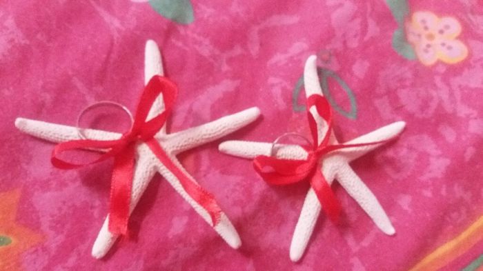 Ciaooo ragazze oggi ho fatto la prova del porta fedi...2 stelle marine...finte ovviamente...il risultato a me piace moltissimo,ovviamente i fiocchi sono da sistemare un po togliendo gli sfilacci ma direi che dopo sono perfetti cosa dire vi...